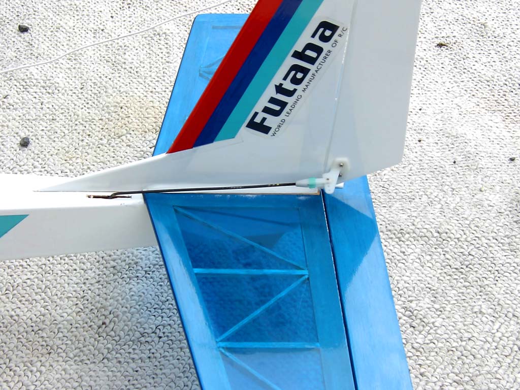 設計者の意図を尊重してエレベーターのトリムは地上で水平面に対して舵面が真直ぐにニュートラルを合わせたら飛ばしている時は特に修正する必要はない。上昇降下はエンジンでコントロールすのが本筋なのでこのヒコーキではややオーバーパワー気味の2サイクル25エンジンを搭載しているので水平飛行はハーフスロットル以下で充分だ。しかもかなりのサイレント飛行が可能なので周囲にかける迷惑も最小限で済む。基本的にエレベーターの役割は旋回時の頭下げを修正するのが本来の使い方となる。