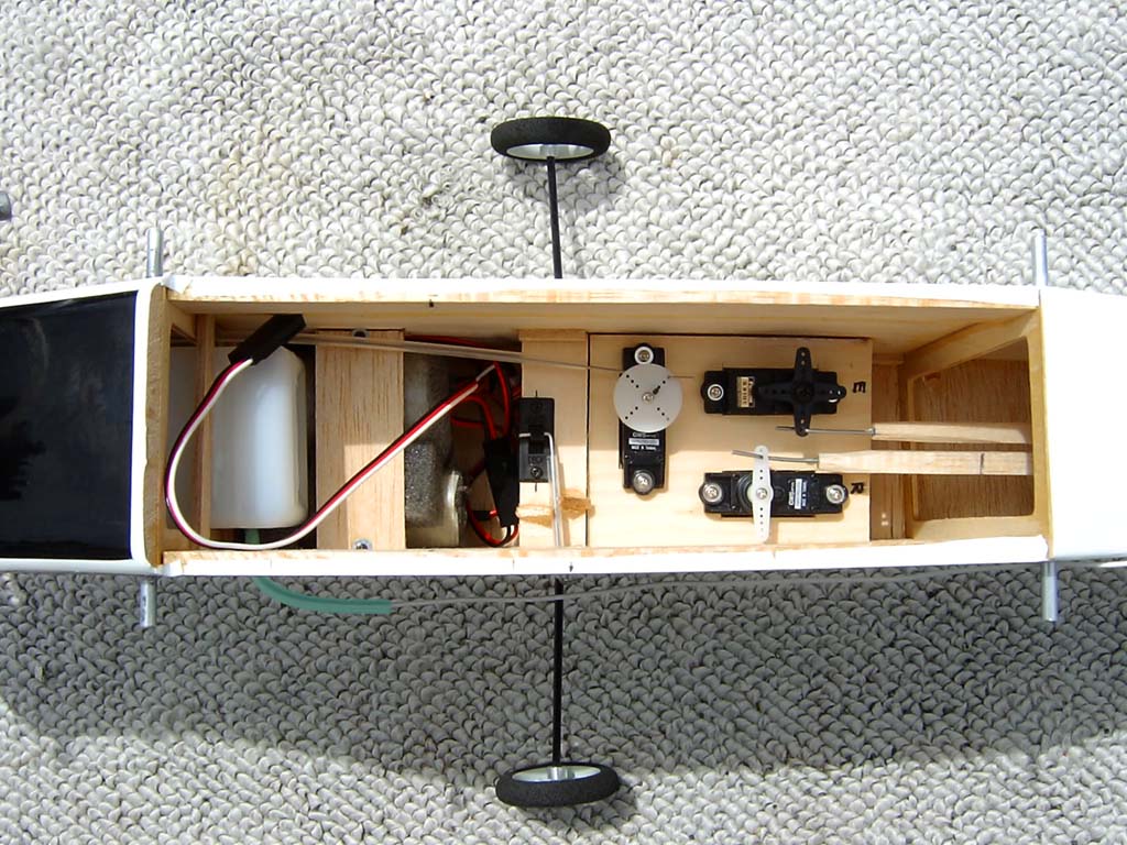 リンケージに関してはしっかりとしたセスナ機タイプのキャビンを持つ設計の胴体なのでスペースがしっかり確保されており普通のサーボやバッテリーを使っても問題なく搭載が可能だ。このヒコーキをフルパワーでギンギンに飛ばす人はまずいないと思うので中スロー以下でゆっくり飛ばすならマイクロサーボ、しかもエレベーター以外なら安価な防震対策が不十分な電動機用のサーボでも問題なく使用できると思う。バッテリーに関しても軽量な320mmAのニッケル水素がベストマッチで10分位の飛行なら3回ほど飛ばす事ができる。