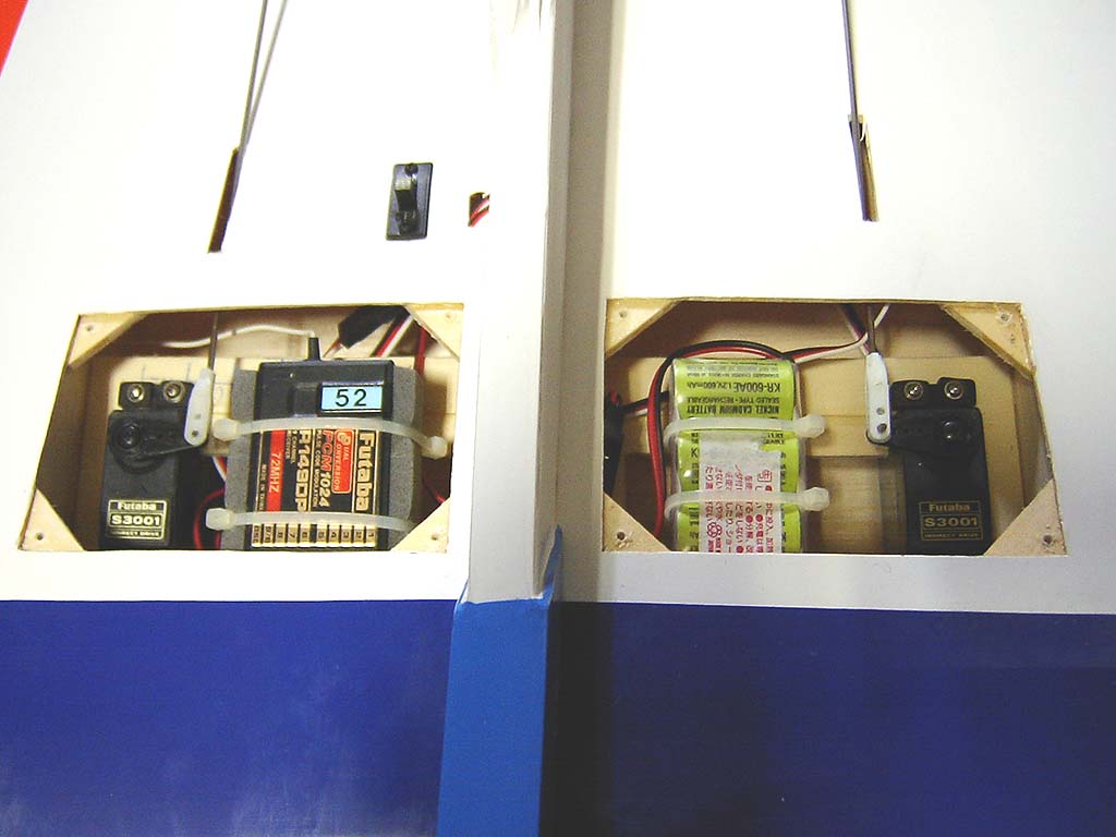 主翼内のメカ積みの様子です。充電コネクタが外に出てないのでちょっとメンドイっす。RC HOBBYに行ったらコネクタキャップを買ってこなくっちゃ(^o^)丿。