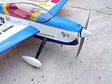 - 飛行場が芝の場合や雨が降った後など地面が軟弱だと3.5mmのピアノ線の足だと、ピッチの強いプロペラを使っていると機速が殺しにくく曲げてしまい、つんのめってプロペラを傷めてしまいやすいのでジュラ脚(OK製)かカーボン脚(ヒロボー製)に換えた方がいいかも知れない。平足にするとますますナイフエッジ性能が上るよ。
