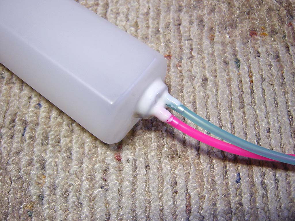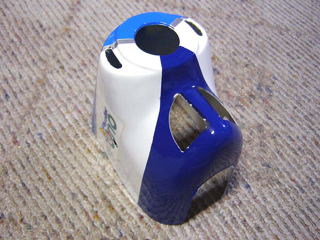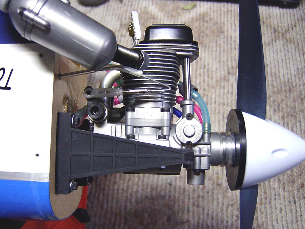 タンクはOK製の320cc、これでパターン練習を10〜12分位できる容量で比較的スリムだったのでOK製にした。ちなみにエンジンは倒立で常に裏返しにして整備や燃料補給などの作業をしようと思ったのでエアー抜きのパイプは下向きにした。キャップ部はスーパーXでプレッシャー圧で抜けないように固めた。( ゚Д゚)/ 抜けたら大変・・・・